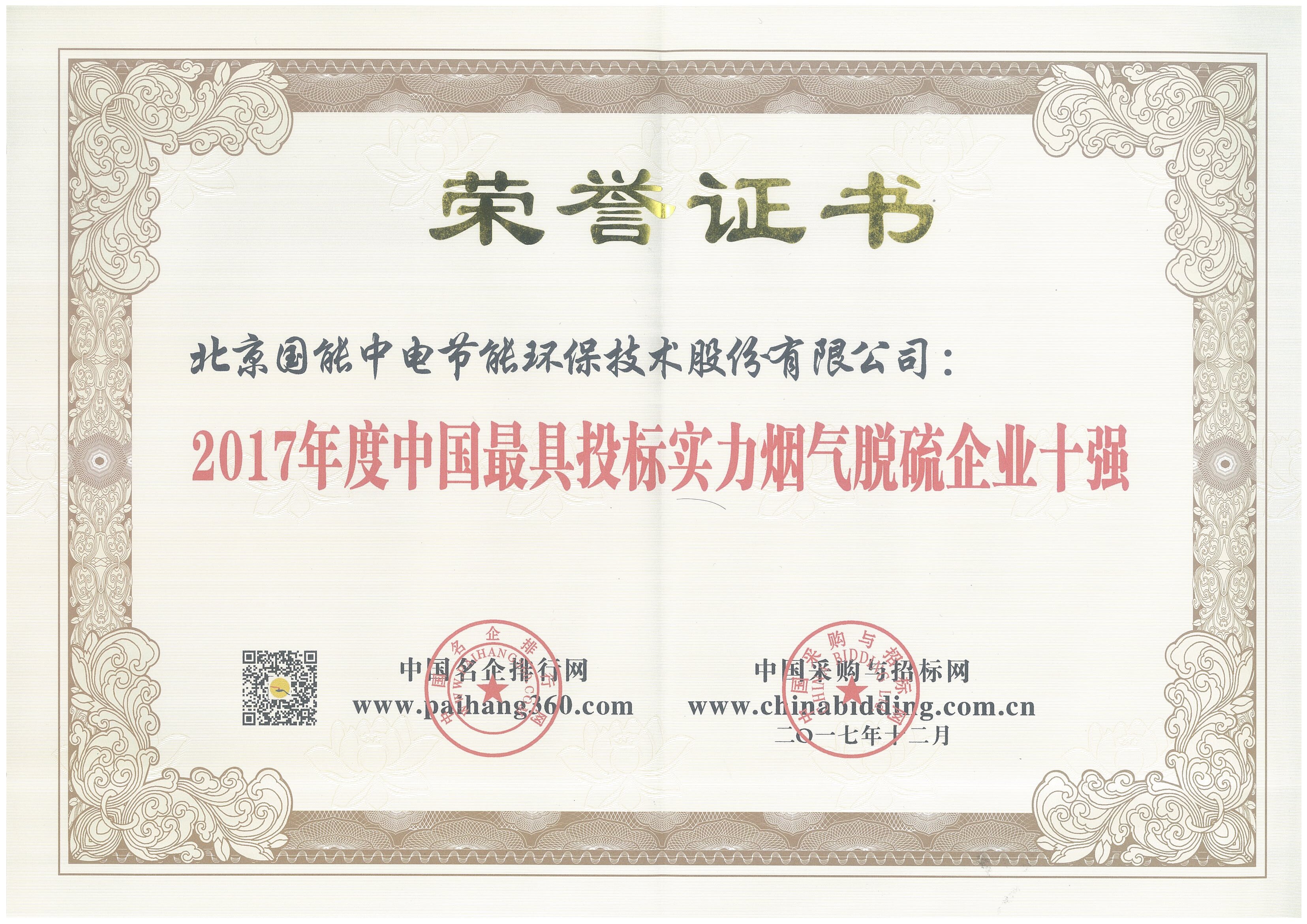 2017年度中國最具投標實力煙氣脫硫企業十強