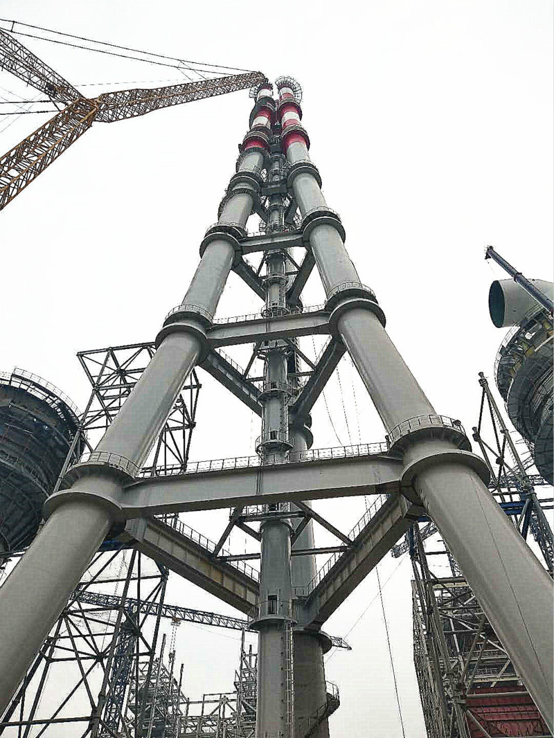 2018年12月25日上午10點10分,山鋼日照精品鋼基地2×350MW自備電廠工程三管自立式鋼煙囪第七層A、B、C筒順利吊裝就位,煙囪主體鋼結(jié)構(gòu)吊裝到頂。這標(biāo)志著我國第一根180米三管自立式鋼煙囪,也是首根采用內(nèi)壁鈦板貼襯防腐的大型鋼管結(jié)構(gòu)煙囪的落成。