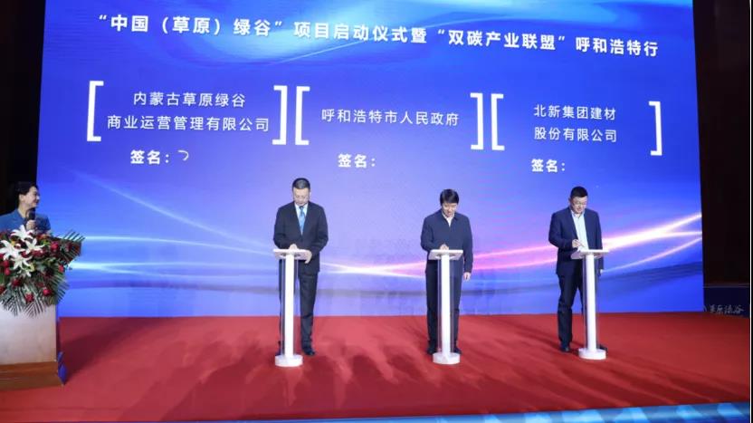 呼和浩特市委副書記、市長賀海東與盤古智庫秘書長、中美綠色基金CEO王俊灃為草原綠谷項目揭牌